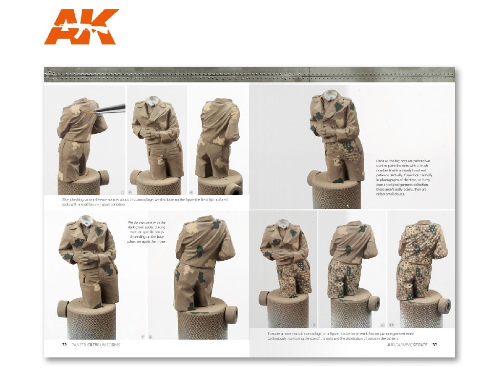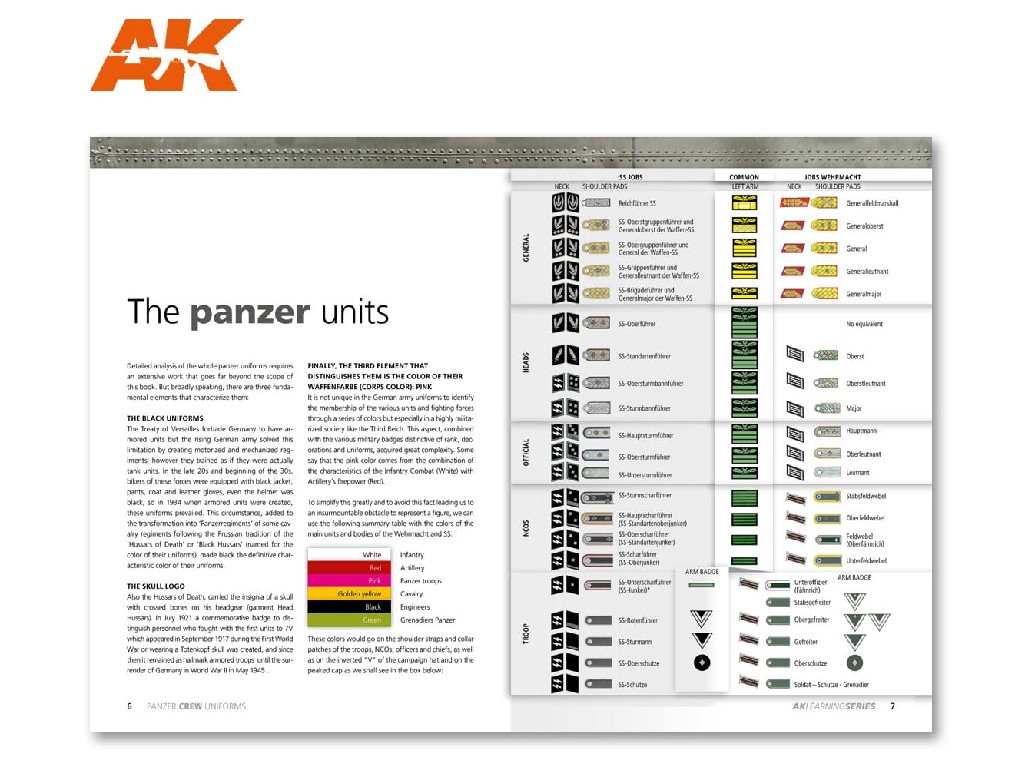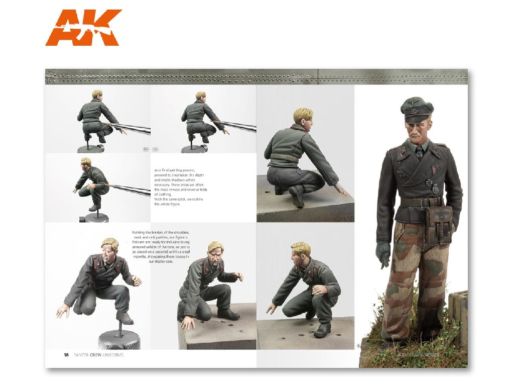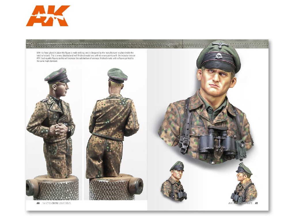 Podrobný pohled na tyto obrněné jednotky a barvy. V této knize najdeme podrobný návod jak namalovat uniformy. Od klasické černé uniformy až po maskovací oděvy až po postup malby hlav vojáků. Rozsáhlý text vysvětlující různé techniky a styly pro dosažení dobrých výsledků posádek Panzer během druhé světové války. Zahrnuje historický úvod, podrobný text těchto jednotek, tabulku vojenských hodností, stejně jako kresby obličejů a fotografickou galerii, která je použita jako odkaz.