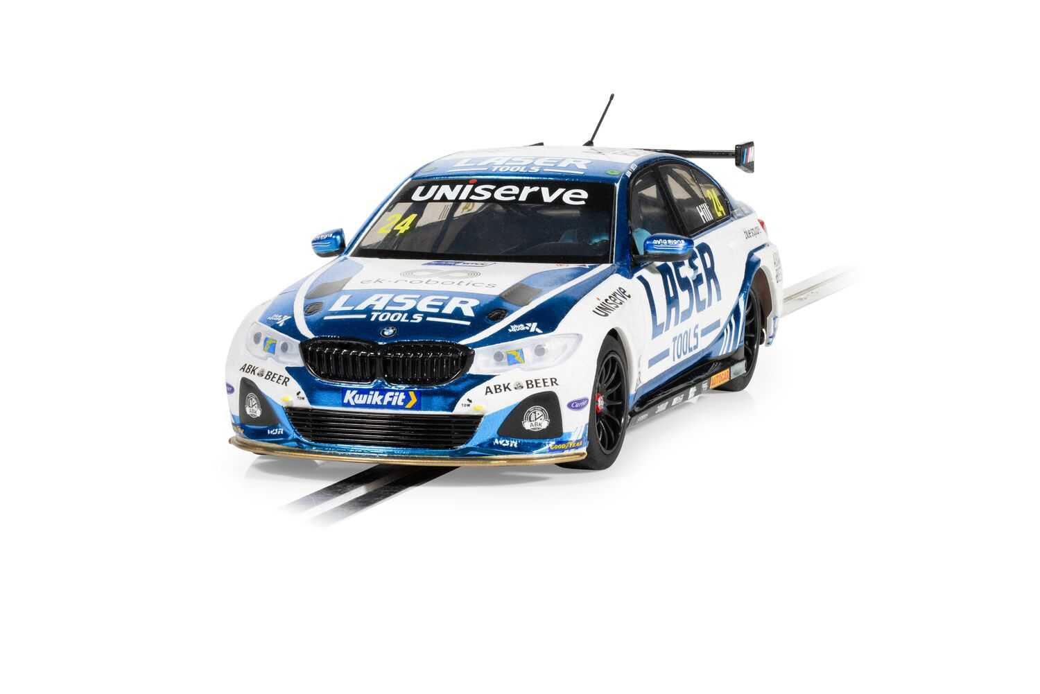 BMW 330e NGTC, které bude v roce 2023 řídit Jake Hill, je ztělesněním precizního inženýrství a závodní dokonalosti. Tento vůz Scalextric kombinuje špičkovou technologii s pečlivým designem a zachycuje ducha moderních závodních cestovních vozů. Od jeho elegantní aerodynamiky až po dynamické sponzorské zbarvení Laser Tools, každý detail odráží závazek BMW k výkonu a inovacím na závodní trati.