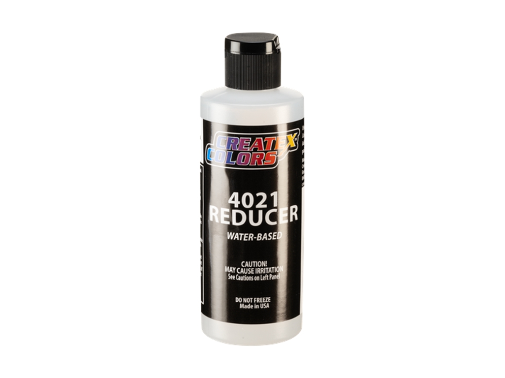 Speciální ředidlo 4021 Reducer od Createxu slouží k naředění všech vodou ředitelných barev Createx. Zajišťuje lepší rozliv, zamezuje efektu "stippling" a eliminuje zasychání barvy na trysce (tip-dry). Je čiré a nemění odstín barvy.