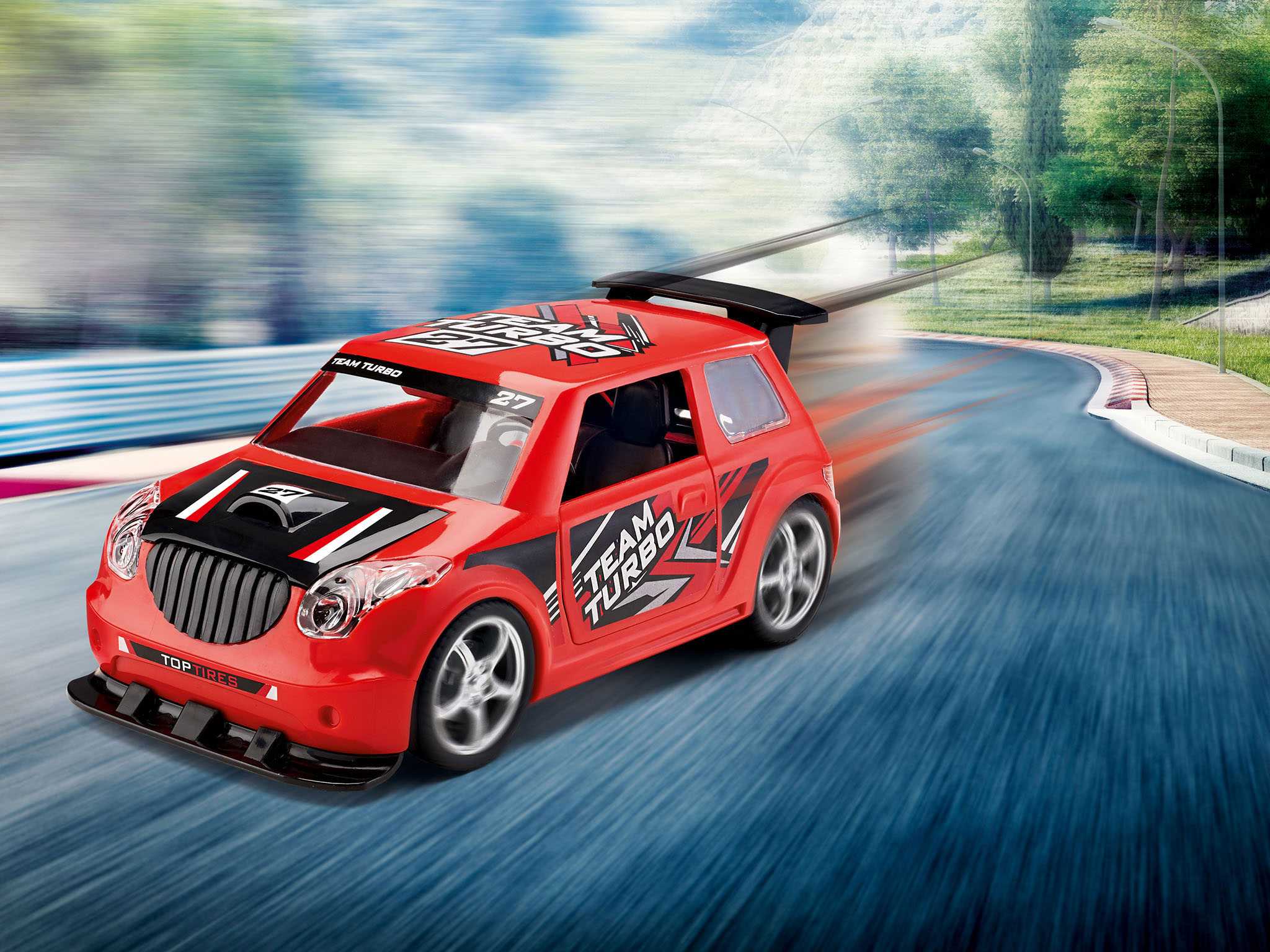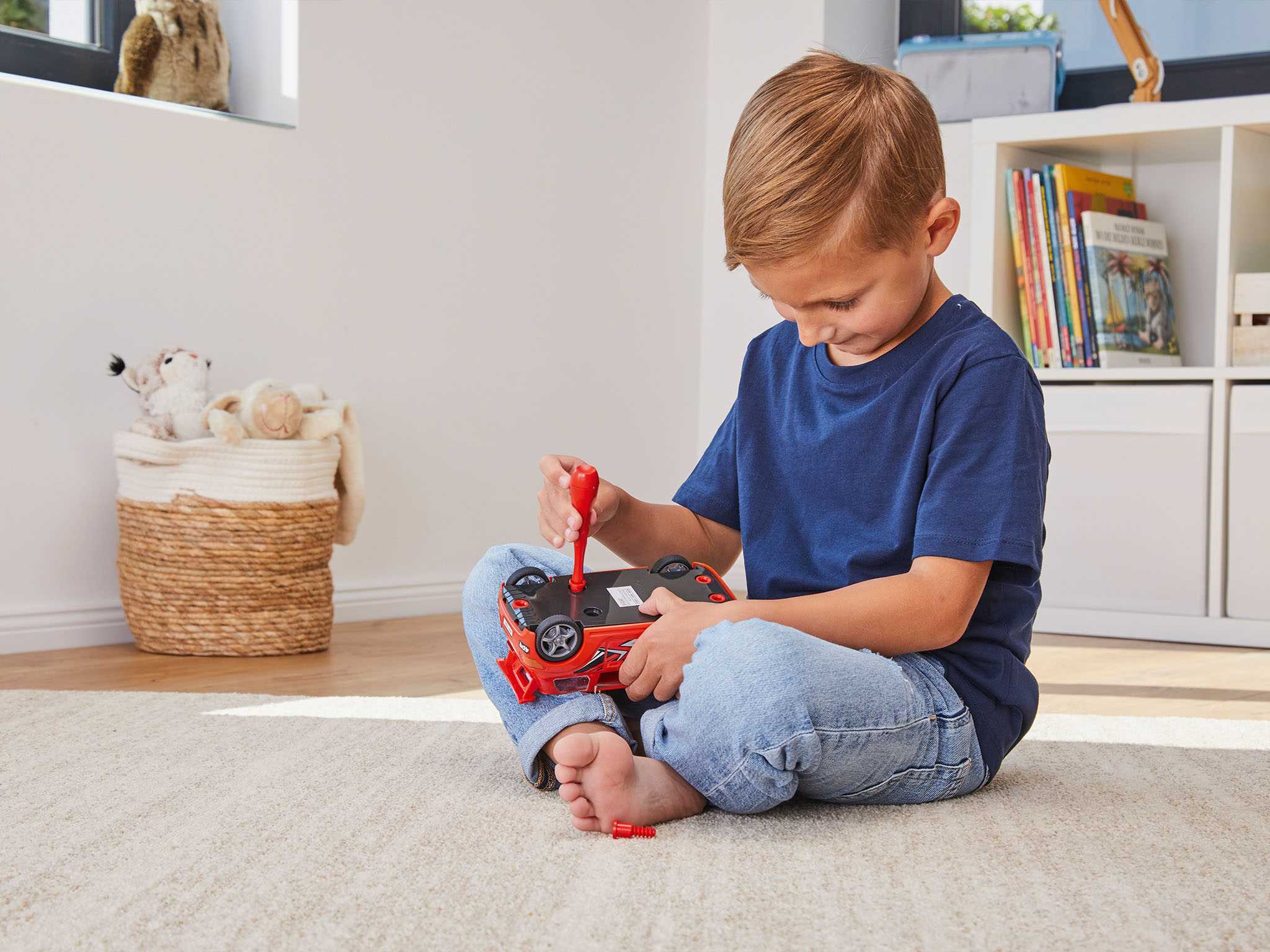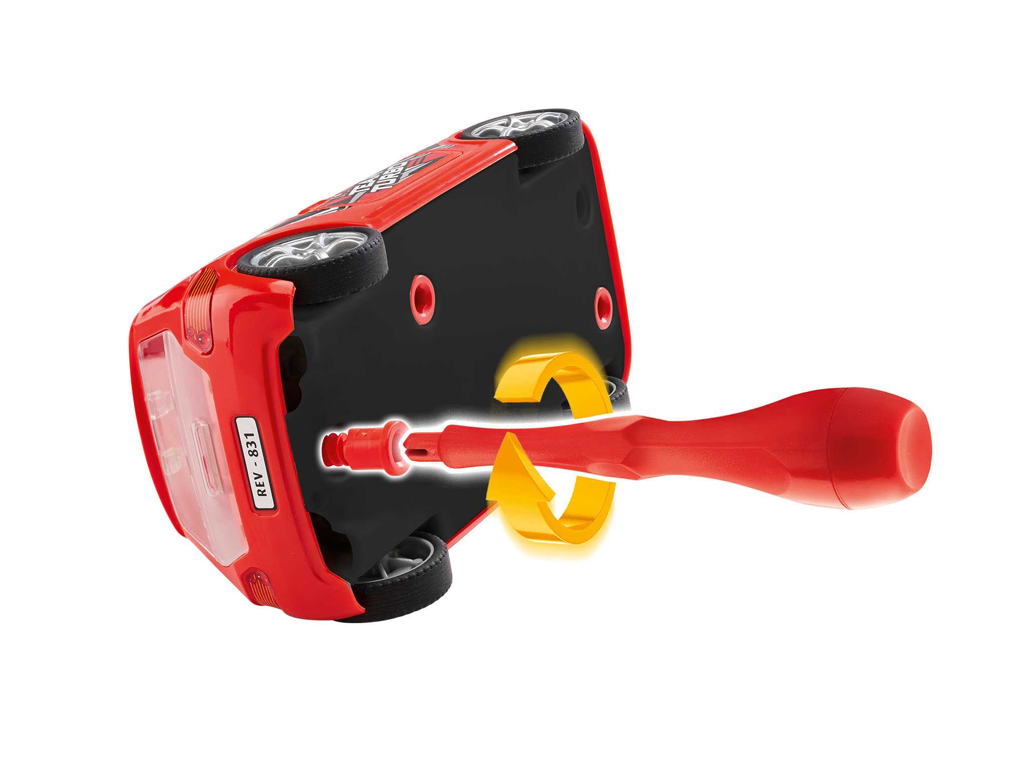 Jednoduše natáhni a nech závodní auto Revell First Construction pořádně šlápnout na plyn! Sestav 18 dílků přizpůsobených pro děti, utáhni šrouby a užij si parádní závodní souboje, pro které je natahovací motorek jako stvořený. Délka: cca 18 cm. Přiložené „tuningové“ díly umožňují změnit vzhled vozidla, kdykoli se ti zachce. Stačí přiloženým šroubovákem odmontovat několik součástek, vyměnit díly za tuningové a pustit se do závodů s novým vylepšeným vzhledem.