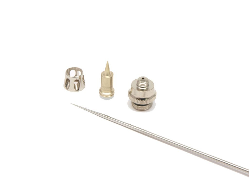 Přestavovací set pro airbrush pistole Harder & Steenbeck typu EVOLUTION LIMITED blackSet obsahuje jehlu, trysku, kryt trysky a difuzor.NÁHRADNÍ DÍLY OBJEDNÁVÁME 1X ZA 14 DNÍ. Foto je ilustrativní
