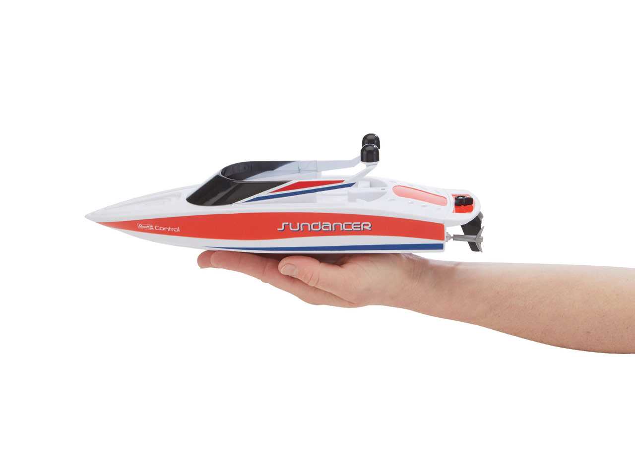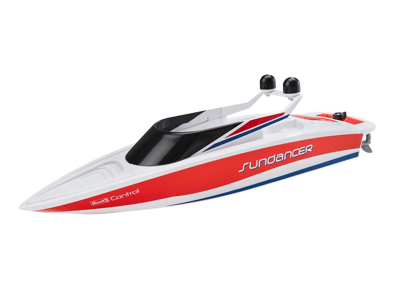 Nastupte na palubu a opřete se do vln se svou vlastní jachtou. Revell Control Sundancer je dokonalý člun vybavený nejmodernější technologií. Dva elektromotorky a zabudovaná Li-Ion baterie mu dávají dostatečný výkon i čas na plavbu. S přibalenou USB nabíječkou můžete svou jachtu dobýt prostřednictvím kteréhokoliv USB portu. Zcela zapouzdřená elektronika je dobře chráněná před vodou dokonce i při nejdivočejších manévrech. 2.4Ghz technologie vám umožní ovládat své čluny i s více přáteli najednou, aniž by se vaše signály navzájem rušily. Ochranný okruh zamezuje spouštění lodních šroubů, pokud je člun na souši. Nehrozí tak žádné zranění.