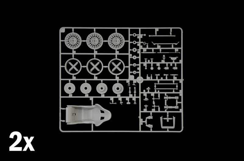 2 archy s úžasnými obtisky – chromované díly a díly z fotoleptaného kovu – Zástěrky z černého acetátu – Sada příslušenství s hadičkami, šroubky a pružinami – Otevíratelná kapota a zadní dveře – Otevíratelné přední dveře – Velmi detailní interiér – Věrné ztvárnění motorového prostoru – Funkční zavěšení kol – Terénní ráfky kol a gumové pneumatiky – Řiditelná kola – Barevný návod na sestavení