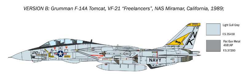 Americký nadzvukový dvoumotorový Grumman F-14 Tomcat byl v 80. a 90. letech ikonou stíhacích eskader námořnictva Spojených států. Typická pro něj byla koncepce křídel s měnitelnou geometrií, dvojitý ocas a dvoumístná kabina s tandemovým uspořádáním. “Tomcat” se mohl chlubit opravdu výjimečnými letovými charakteristikami. Díky jeho dvěma dvouproudovým motorům General Electric s přídavným spalováním dokázal dosáhnout maximální rychlosti 2,34 Machu. Vyzbrojen byl 20mm rotačním kanónem M61 Vulcan a kromě konvenčnějších raket AIM-9 Sidewinder a AIM-7 Sparrow mohl používat i radarem naváděné dalekonosné střely AIM-54 Phoenix. F-14 vstoupila do služby v 70. letech, kdy nahradila F-4 Phantom II v roli získávání vzdušné převahy. Za svou kariéru se tento stroj zúčastnil mnoha vojenských operací od krize v zálivu Sidra po válku v Iráku.