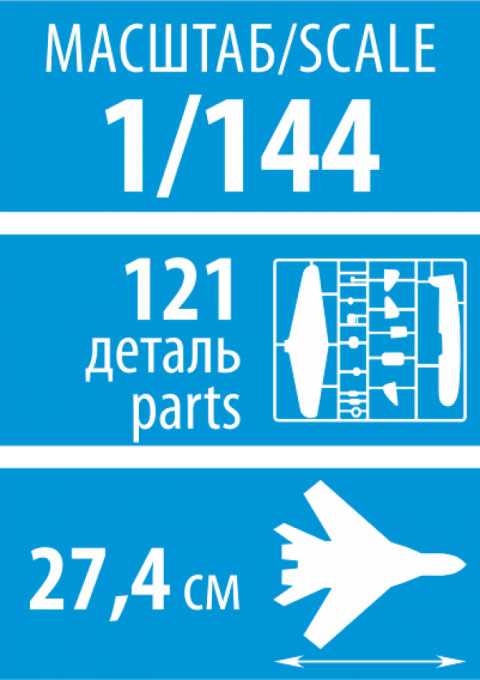 Model letadla ke slepení. Velikost: 1:144; 27,4 cm. Počet dílků: 121.Informace o modelu:Doporučené barvy (Zvezda):Detaily modelu: Měřítko: 1:144 Délka: 274 mm Počet dílků: 121 Doporučeno pro děti od 10 let. Upozornění: Nebezpečí udušení! Výrobek obsahuje malé části. NEVHODNÉ PRO DĚTI DO 3 LET!