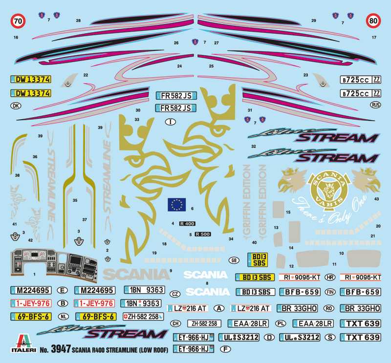 Scania řady R Streamline je navržena tak, aby splňovala nejvyšší požadavky na úsporu paliva, pohodlí řidiče a spolehlivost. Jedinečný design se dokonale doplňuje s novými výjimečnými interiéry, které nabízejí nadstandardní komfort pro řidiče a širokou škálu barev a materiálů. K dostání je s motory V8 i řadovými agregáty. Bytelné, dobře reagující a efektivní motory Scania V8 jsou konstruovány tak, aby zvládly i ty nejnáročnější práce. Náš model je také doplněn obtisky a přesně vyřezanými kovovými samolepkami, které stačí jen nalepit a dotáhnout tak tento tahač do podoby věrné kopie své skutečné předlohy.