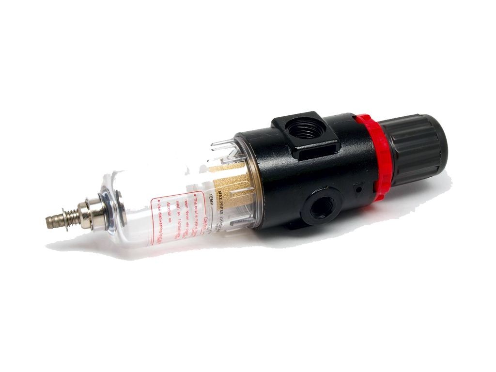 Regulátor tlaku vzduchu s plynulou regulací. Součástí je filtr vzduchu a manometr. Regulátor je na vstupu a výstupu vzduchu opatřen vnitřním závitem G-1/4". Maximální tlak 8 bar. Zajistí čistý, suchý a regulovaný vzduch.