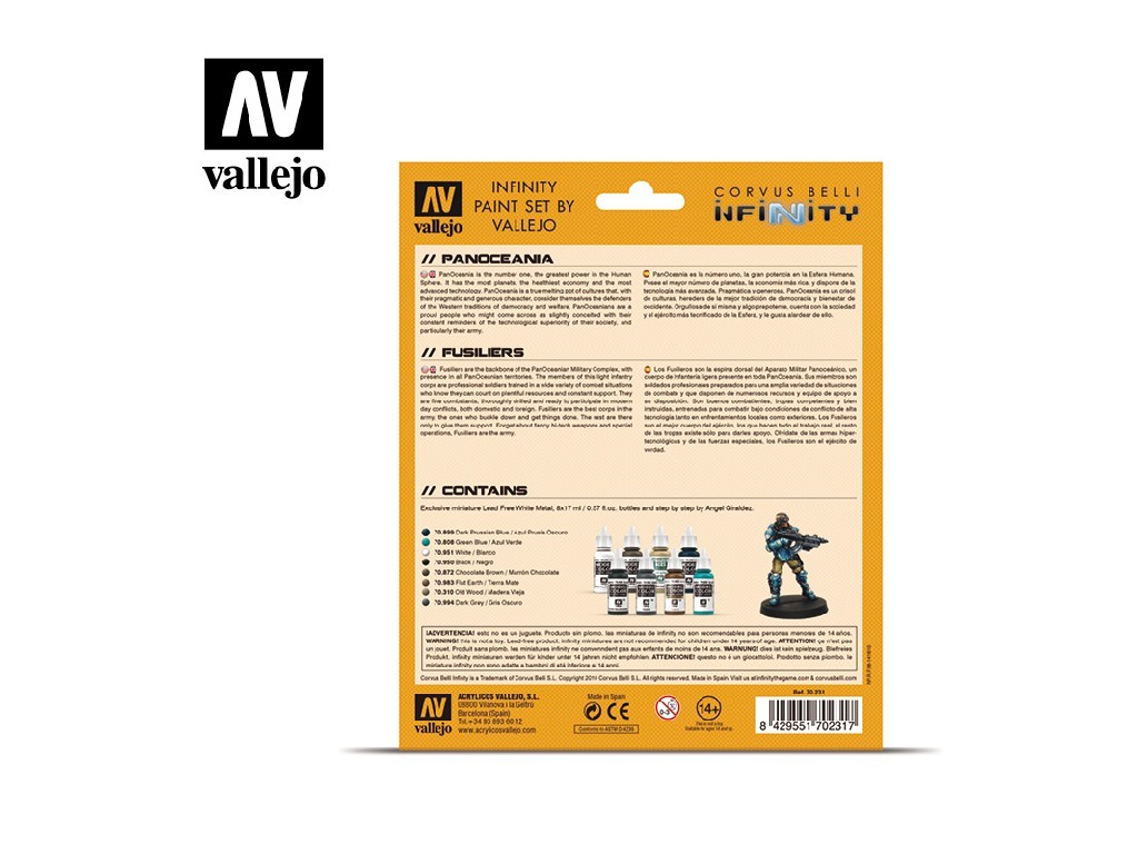 Tahle sada obsahuje odstíny doporučené přímo výrobcem Corvus Belli pro nabarvení jednotek Panoceania. Součástí balení je i exkluzivní figurka.