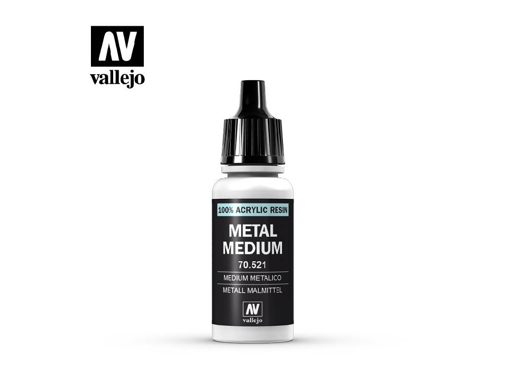 Vallejo Metal Medium je speciální přísada, která přemění běžnou akrylovou barvu na metalickou. Obsahuje jemné metalické pigmenty, které dodávají barvě lesk a třpyt. Skvělé pro vytváření vlastních kovových odstínů, zvýraznění detailů nebo efekty na zbraně, brnění, strojní části a sci-fi modely.