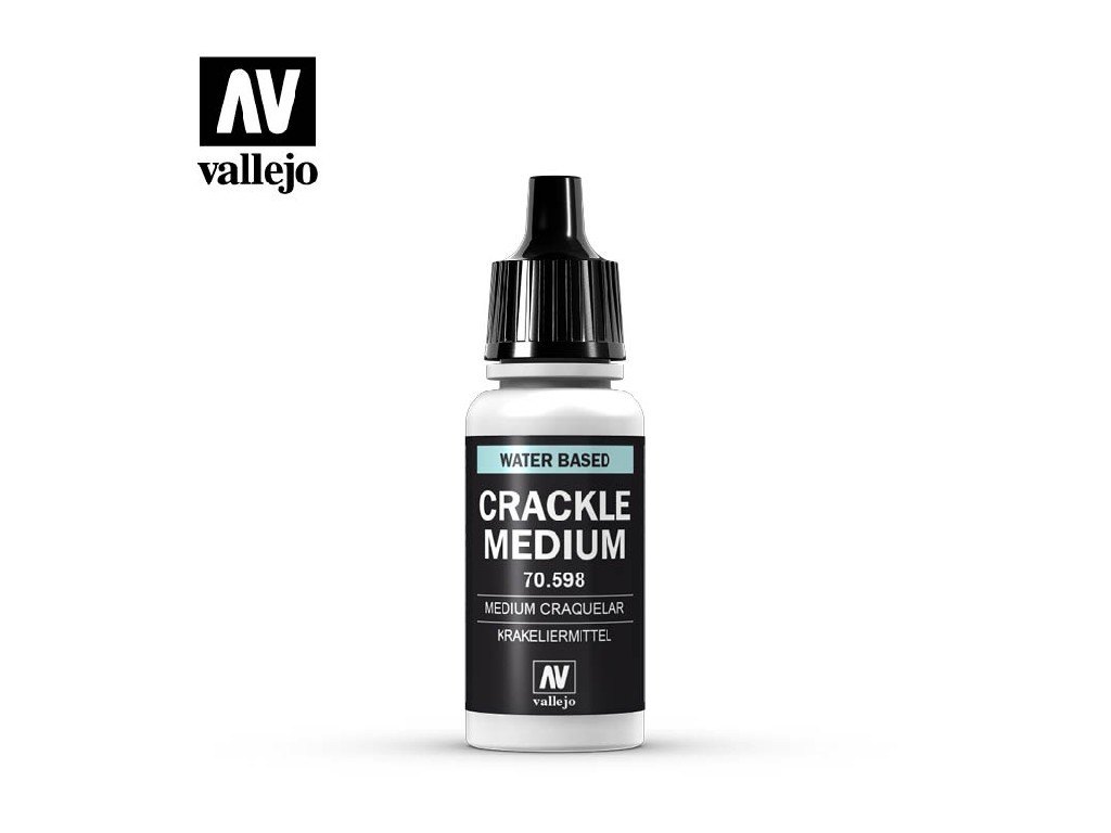 Vallejo Crackle Medium je speciální přísada pro vytváření realistických prasklin na povrchu modelu. Aplikuje se mezi dvě vrstvy akrylové barvy a během schnutí způsobí popraskání horní vrstvy. Skvělé pro efekty odlupující se barvy, vysušené zeminy, stárnutí povrchu nebo fantasy/texturové projekty.